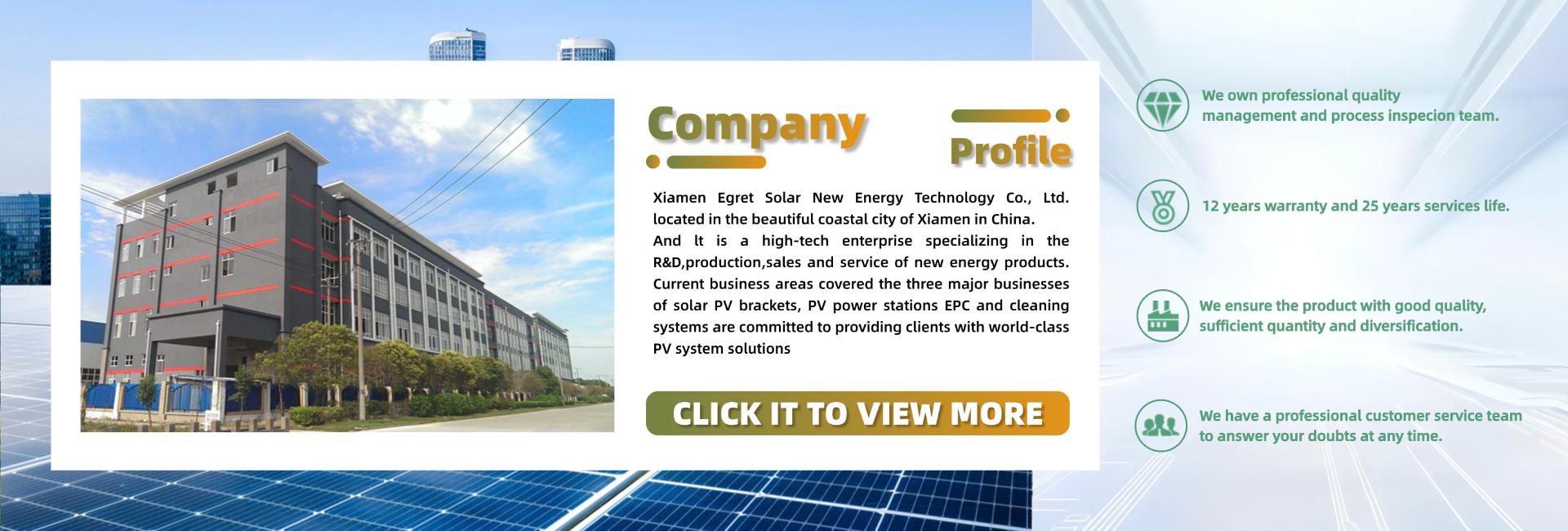 Xiamen Egret Solar New Energy Technology Co.. Ltd.located in the beautiful coastal city of Xiamen in China.And lt is a high-tech enterprise specializing in theR&D,production,sales and service of new energy products.Current business areas covered the three major businessesof solar pv brackets, pv power stations ÉPC and cleaningsystems are committed to providing clients with world-classpV system solutions