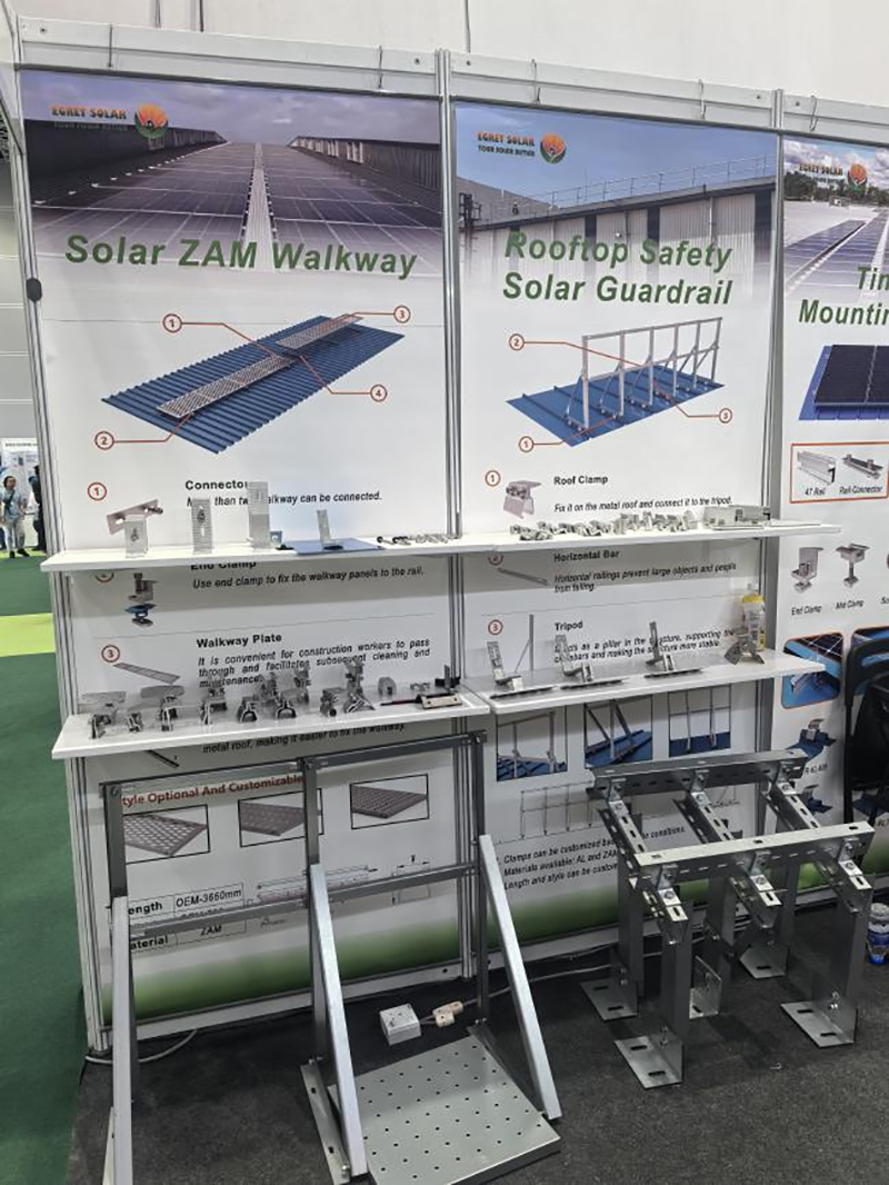 At the exhibition, we showcased several rooftop accessories, including clamps, hooks, and L feet. Customers can choose different combinations based on their installation environment. Clamps or L feet are used for color-coated steel tiles, while roof tile hook solar are used for ceramic tiles. We can also customize clamps based on the customer's color-coated steel tile model or extend the hook's arm to suit on-site usage.